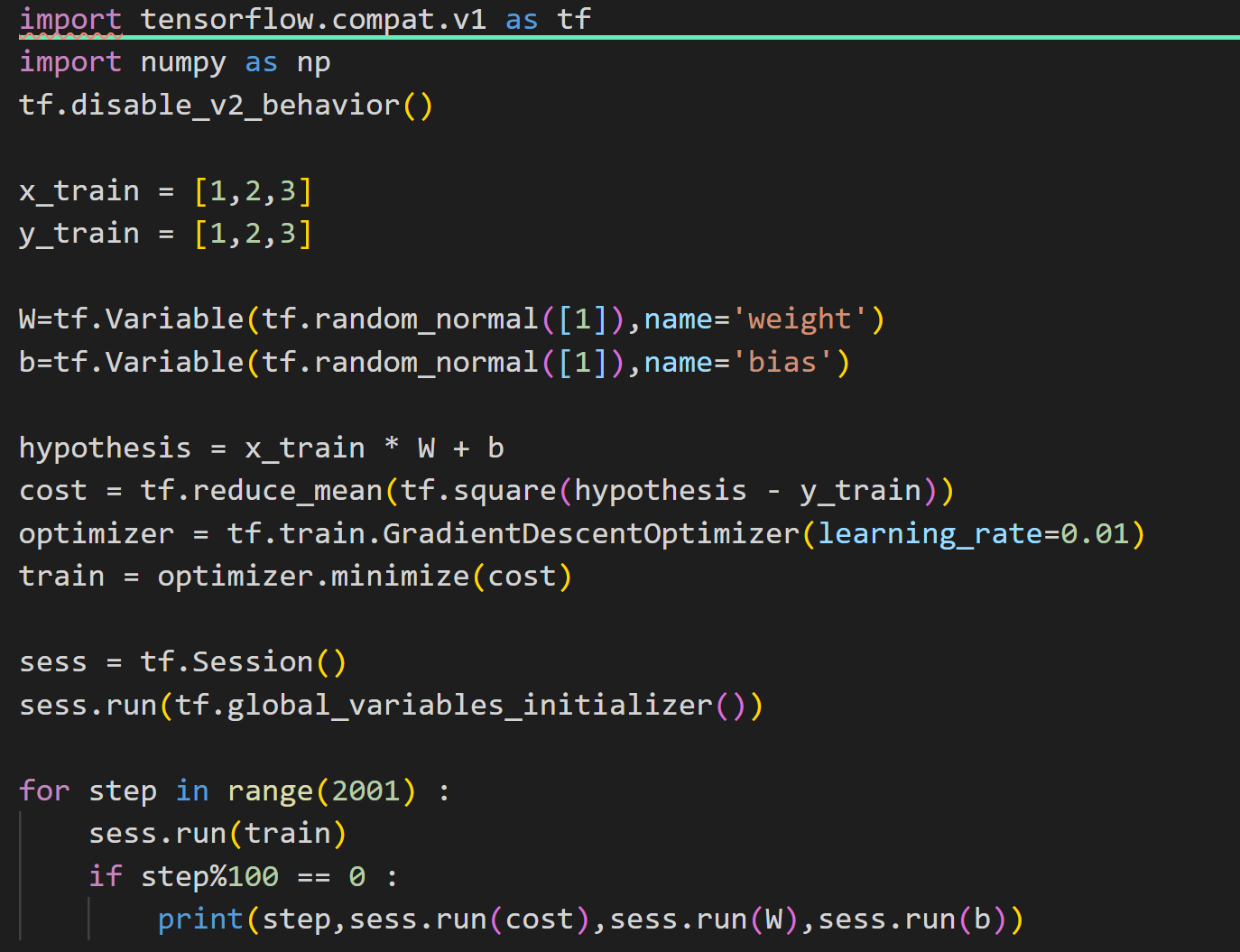 ① for step in range(2001) : 2000번의 반복으로 cost가 0이되는 부분을 찾겠다