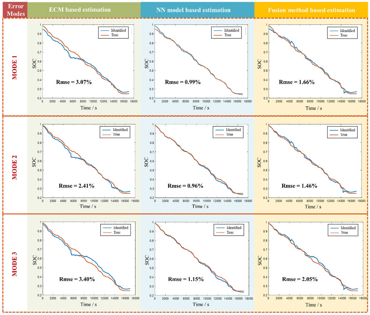 본 논문은 OCV Plateau구간에서만 NN을 쓰고, 나머지영역에서는 ECM을 쓴다고하는데, 성능은 NN Only가 가장 좋습니다. 그리고 RMSE로 나타나져서 있어서 그런데 NN Only를 제외하곤 추정 성능이 개판입니다.