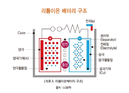 반대로 양극에 들어갈때는 전자와 리튬이온이 만나 리튬원자가 되기때문에 전자를 받는 화학 반응(환원)이 발생하.