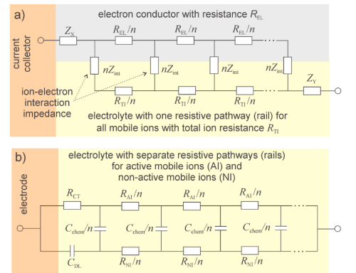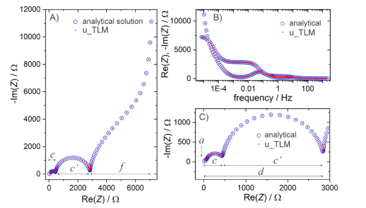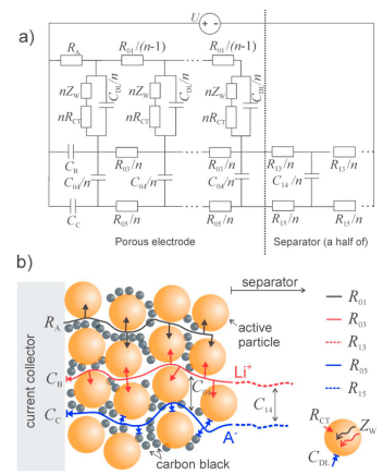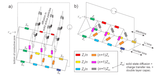 TLM은 전기적 회로요소로 구성된 네트워크를 사용하여 전극 내에서 발생하는 전하 전달, 이온 확산, 전극/전해질간의 화학적 관계성을 모델링합니다.