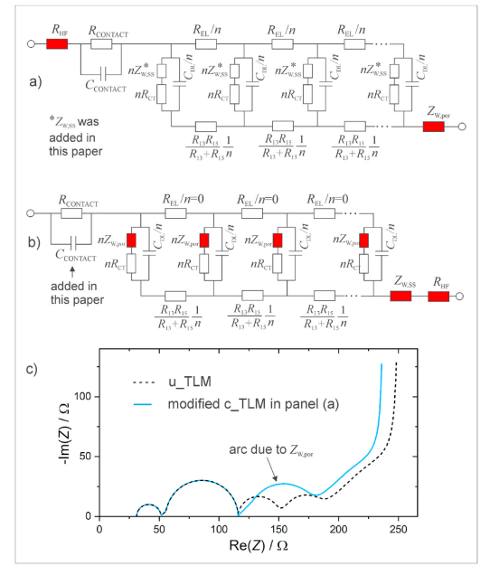 a)는 Conventional TLM, b)는 저주파 전해질 Diffusion성분을 추가한 모델입니다.