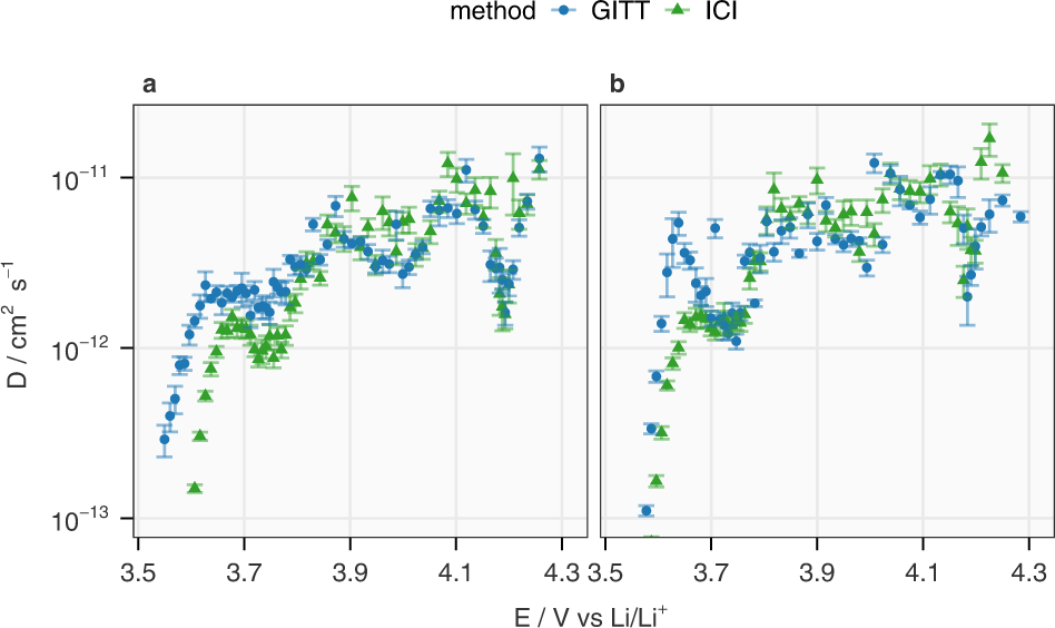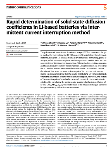 [1] Chien, YC., Liu, H., Menon, A.S. et al. Rapid determination of solid-state diffusion coefficients in Li-based batteries via intermittent current interruption method. Nat Commun