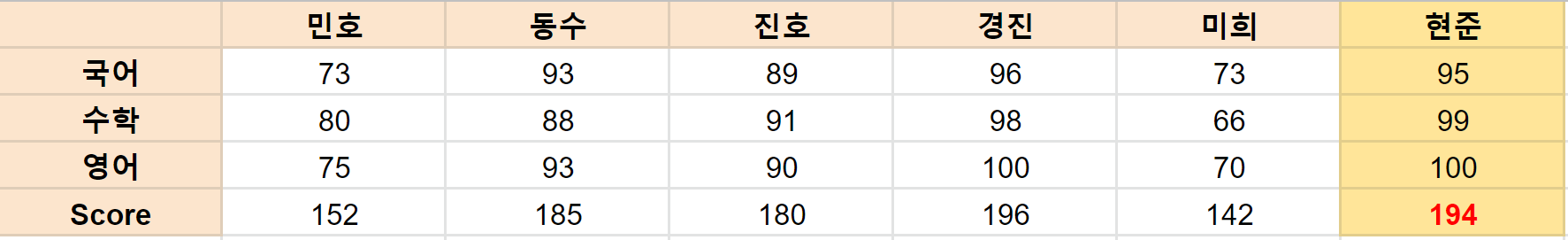 이때 현준이가 표와 같은 국영수 점수를 받았을때 최종 Score는 무엇일까요??