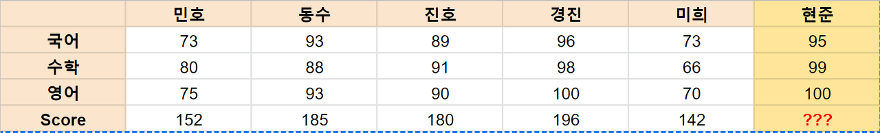 즉, 이말은 5명(민호/동수/진호/경진/미희)의 점수를 국어/수학/영어 각각의 항목에 대해 모두 적어준것을 의미합니다.