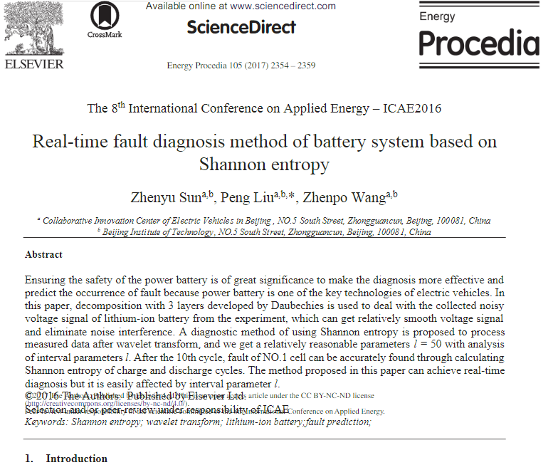[1] Zhenyu Sun, Peng Liu, Zhenpo Wang,Real-time Fault Diagnosis Method of Battery System Based on Shannon Entropy,Energy Procedia,Volume 105,2017,Pages 2354-2359,ISSN 1876-6102, https://doi.org/10.1016/j.egypro.2017.03.676.