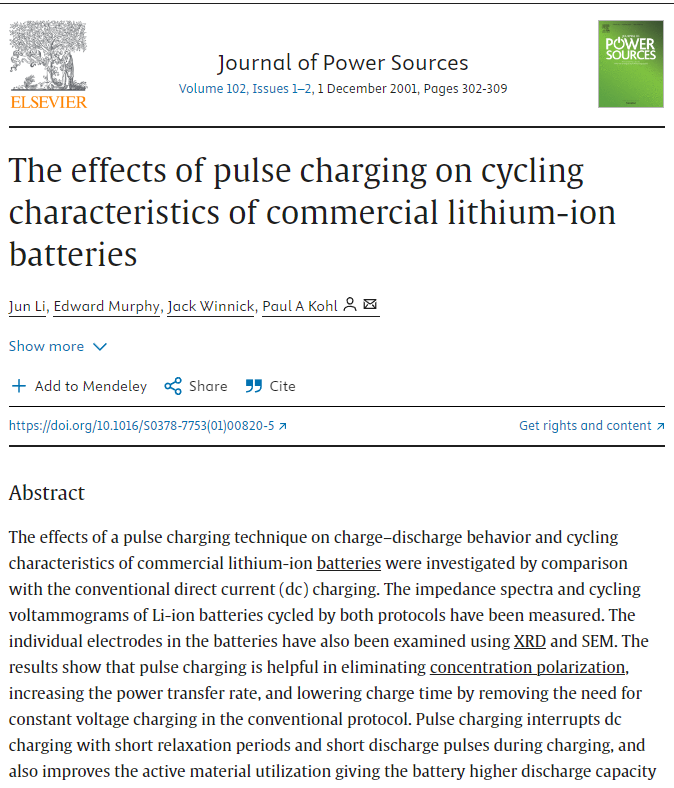 [1] Jun Li, Edward Murphy, Jack Winnick, Paul A Kohl,The effects of pulse charging on cycling characteristics of commercial lithium-ion batteries,Journal of Power Sources,Volume 102, Issues 1–2,2001,Pages 302-309,ISSN 0378-7753,