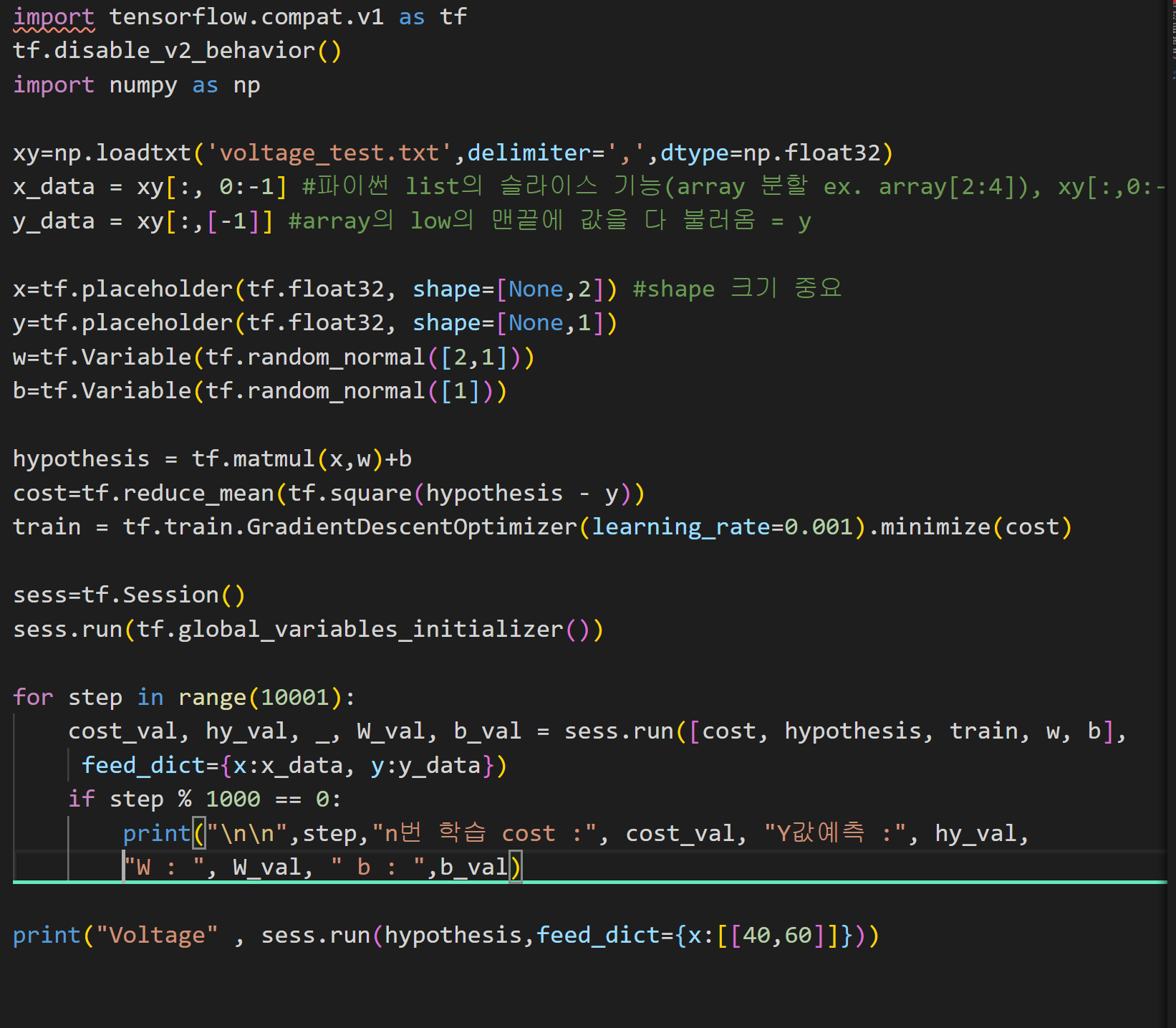 y_data = xy[:,[-1]] 은, voltage_test.txt의 각 줄마다 맨끝의 값을 y_data로 저장하겠다는 뜻입니다.