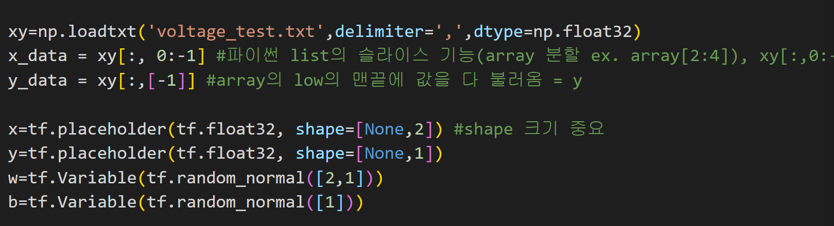 x_data = xy[:, 0:-1] 이라는 뜻은, voltage_test.txt 안에서 맨끝에 1개빼고 차례대로 x_data로 넣겠다를 의미합니다.