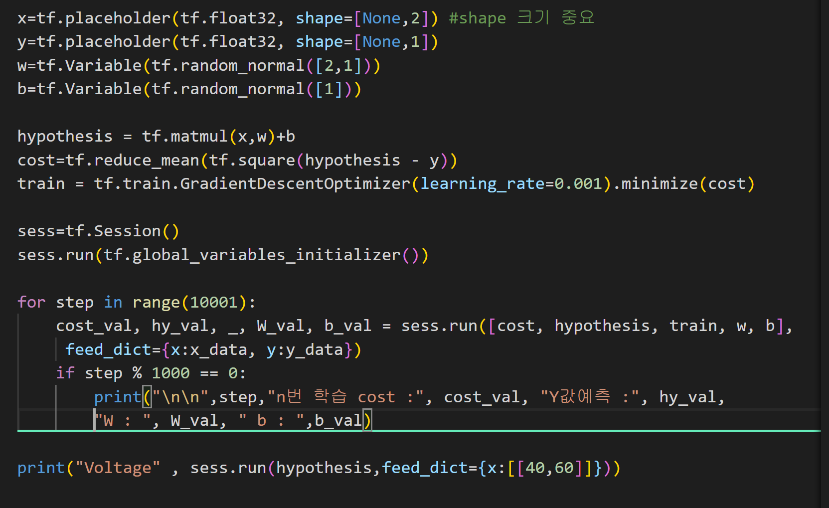 print("Voltage" , sess.run(hypothesis,feed_dict={x:[[40,60]]}))