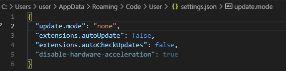 여기서, VSCode 자동업데이트를 막으실분들은 하기와 같이 json 바꾸시면 됩니다.