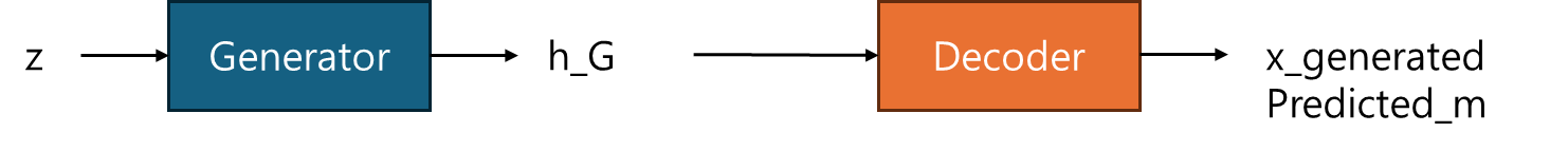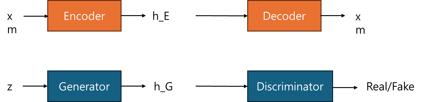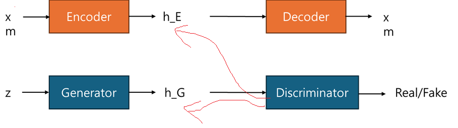 이렇게 설계한 이유는, 상기와 같이 Discriminator가 Encoder의 출력(h_E)와 Generator의 출력(h_G)를 동시에 입력을 받고 학습하여, 다시 BackPropagation하기 때문에, 원본 데이터와 마스크(x,m)의 정보가 Generator에 흘러들어가서 h_G가 h_E의 특성을 더욱 잘 반영할수있게끔 유도하기 때문입니다.
