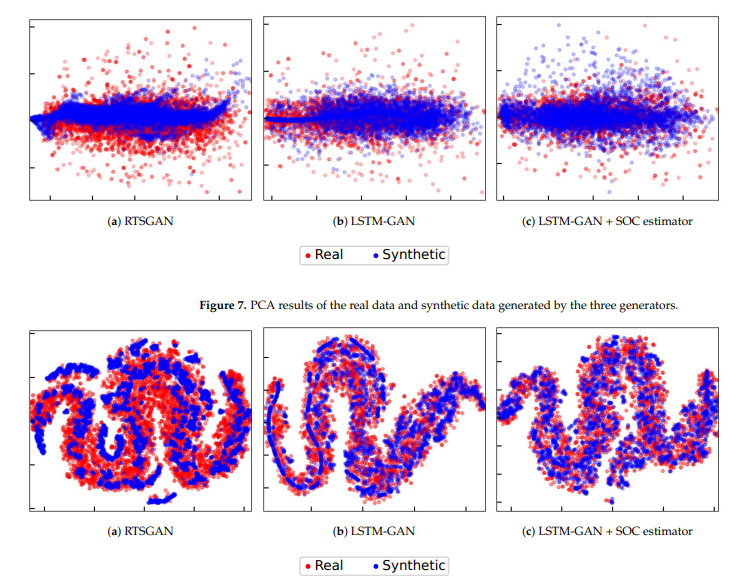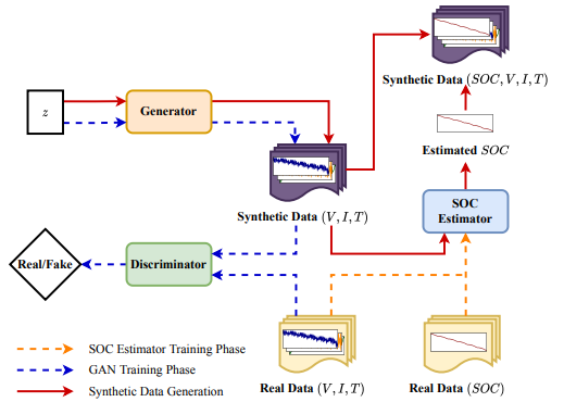 상기 그림에서 보이다시피 GAN을 학습시키고 생성한 V/I/T 데이터로 Pre-trained 된 LSTM 모델에 입력으로 하여 SOC를 Estimation하여 V/I/T/SOC까지 생성한다. 라고합니다.