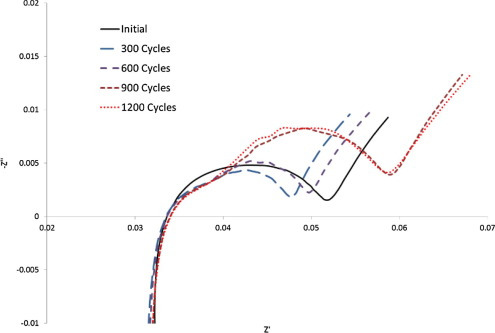사이클이 증가할수록 확연하게 임피던스가 증가하는것을 육안으로도 확인할 수 있을정도입니다.