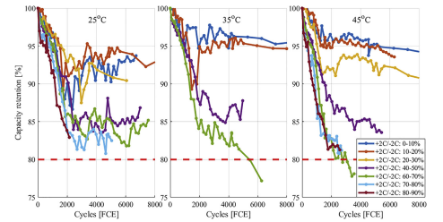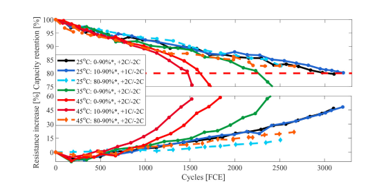 [출처] Evelina Wikner, Erik Björklund, Johan Fridner, Daniel Brandell, Torbjörn Thiringer, How the utilised SOC window in commercial Li-ion pouch cells influence battery ageing, Journal of Power Sources Advances, Volume 8, 2021, 100054, ISSN 2666-2485, https://doi.org/10.1016/j.powera.2021.100054.