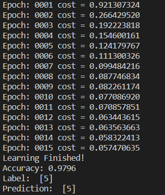 print('Epoch:', '%04d' % (epoch + 1), 'cost =', '{:.9f}'.format(avg_cost))