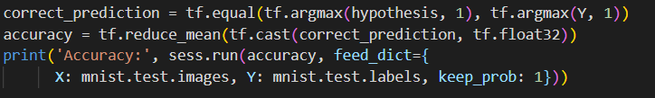 correct_prediction = tf.equal(tf.argmax(hypothesis, 1), tf.argmax(Y, 1))