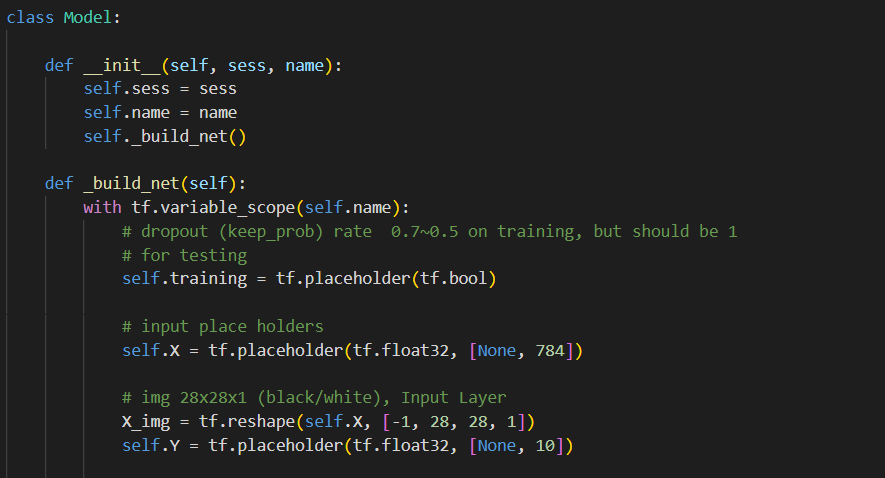 Model이라는 Class 이름으로, 초기화를 해주고(def __init__), CNN Frame을 구축(_build_net)하는 코드입니다.