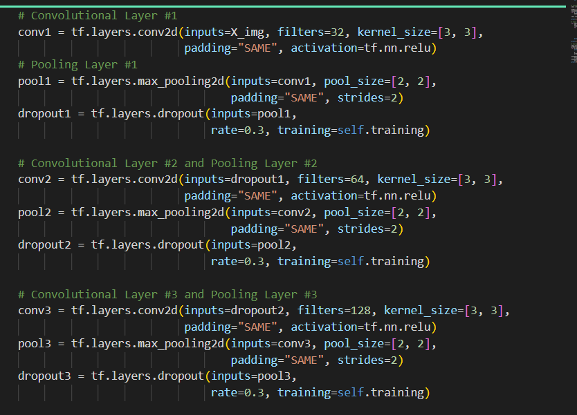 conv3 = tf.layers.conv2d(inputs=dropout2, filters=128, kernel_size=[3, 3],