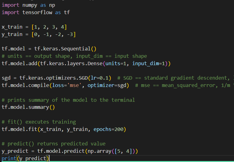 수식을 보니 y=-x+1이라는 선형식으로 트레이닝 데이터를 주고, 예측치가 잘맞는지 확인해보는 코드네요