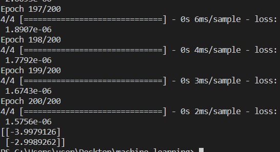200번 정도 학습시키니, -3.9979, -2.9989로 거의 정확한 값이 나오는것을 확인하실 수 있습니다!