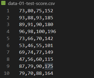 data-01-test-score.csv라는 파일을 읽어와서 학습시켜보는 코드입니다.