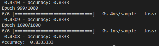 1000번정도 학습시키니 83%정도의 정확도가 나오네요, 5000번 정도 해보니 100에 가까운 정확도가 나오는것을 확인할 수 있었습니다.