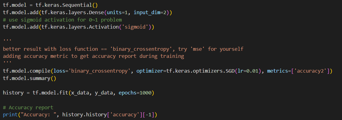 tf.model.add(tf.keras.layers.Activation('sigmoid'))라는 한줄을 추가함으로써, sigmoid activation function을 구현한 모습입니다.