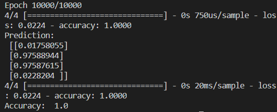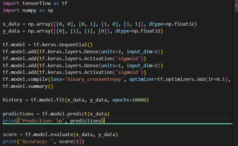 10000번 학습한 결과, x_data는 모두 y_data의 실제값에 맞게 추측하여 정확도 1의 모습을 보여주고 있습니다.