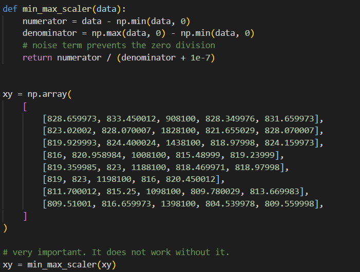 기존의, 머신러닝 학습모델 코드에서 min_max_scaler라는 이름으로 위와 같이 함수를 define해주고, 학습할 데이터를 선언한 이후, 한번 함수를 통과시켜주면 됩니다.