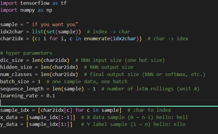 - dic_size : RNN의 input size로 "if you want you"를 학습시키는것이니, 이 문장의 길이만큼에 해당