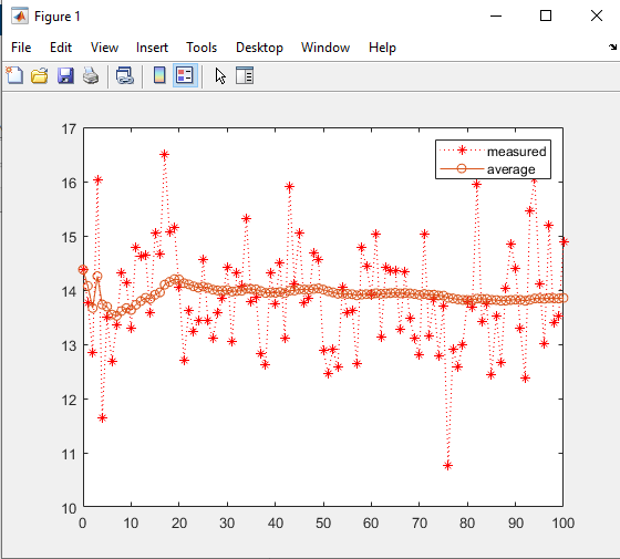 실제 측정된 Measured 값은 10~17V 인데 Average Filter를 통과하는 값은 뒤로갈수록 점차 안정을 찾아 14V로 수렴하는 모습이 보이네요!