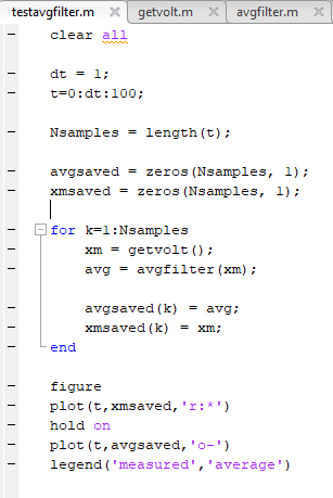 이어, Nsamples = length(t)로 샘플의 갯수를 100개루 맞추어 주고, xm과 avg라는 함수에 100개의 array에 해당하는 값들을 넣어줍니다.