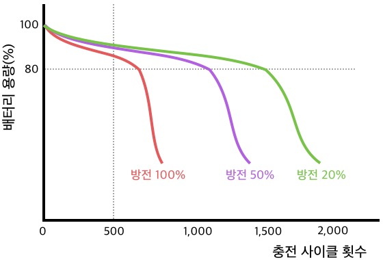위와같은 이유로 휴대폰을 사용할때 0% -> 100%까지 완전 충전/완전 방전을 반복하게되면 당연히 양극재와 음극재의 부피 팽창/축소비도 커지게 되겠죠