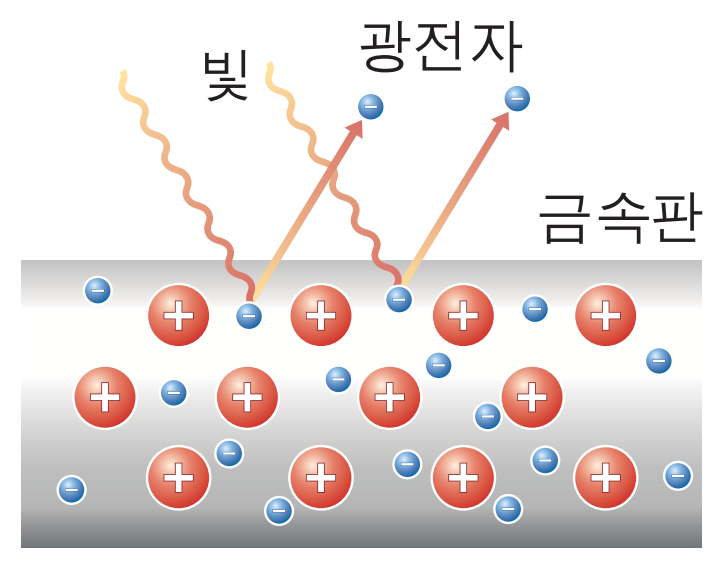 여기서 빛을 전자에 쏴주면 빛의 입자성에 의해, 빛의 입자가 전자를 때려서 전자가 광자의 에너지를 얻어 자유가 되는 현상입니다.