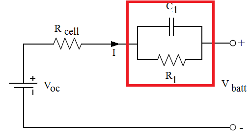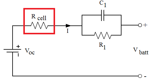 배터리를 1RC모델(1차 RC등가회로모델) 로 나타내면 상기와 같은데, 여기서 R_cell은 전해질의 포화정도(electrolyte